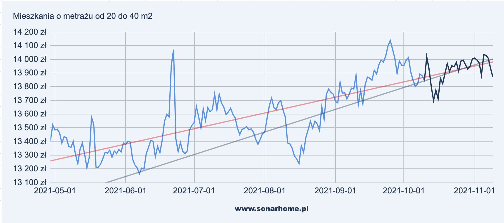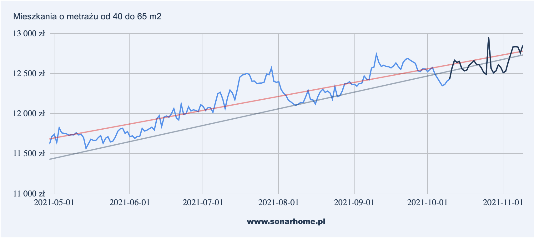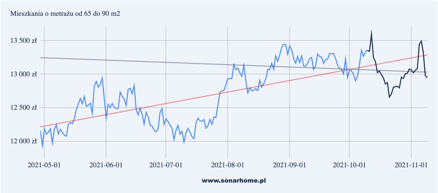 Powyższe wykresy przedstawiają zmianę ofertowej ceny średniej mieszkań w podziale na powierzchnię lokalu. Linia czerwona oznacza dotychczasowy długoterminowy trend zmiany cen mieszkań, szara linia trendu wyznacza trend krótkoterminowy od 01.10.2021 r.