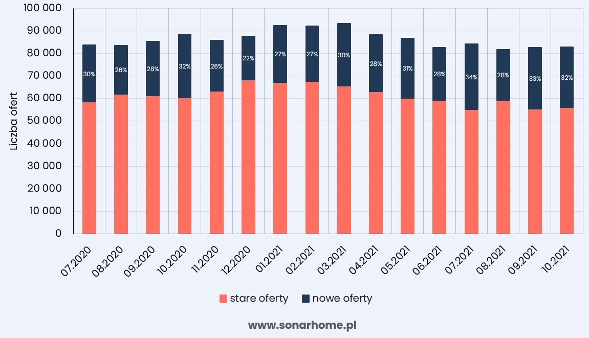 Na chwilę obecną, jak wynika z danych SonarHome, do końca października bieżącego roku nie zmieniła się również wielkość podaży. Liczba nowych, unikalnych ogłoszeń niezmiennie stanowi około 30% ogólnej liczby ofert na portalach internetowych, co oznacza, że do końca października nie obserwujemy ograniczenia ani wzrostu podaży, czyli sytuacji, w której grupa osób sprzedających mieszkanie zaczęłaby maleć bądź rosnąć.