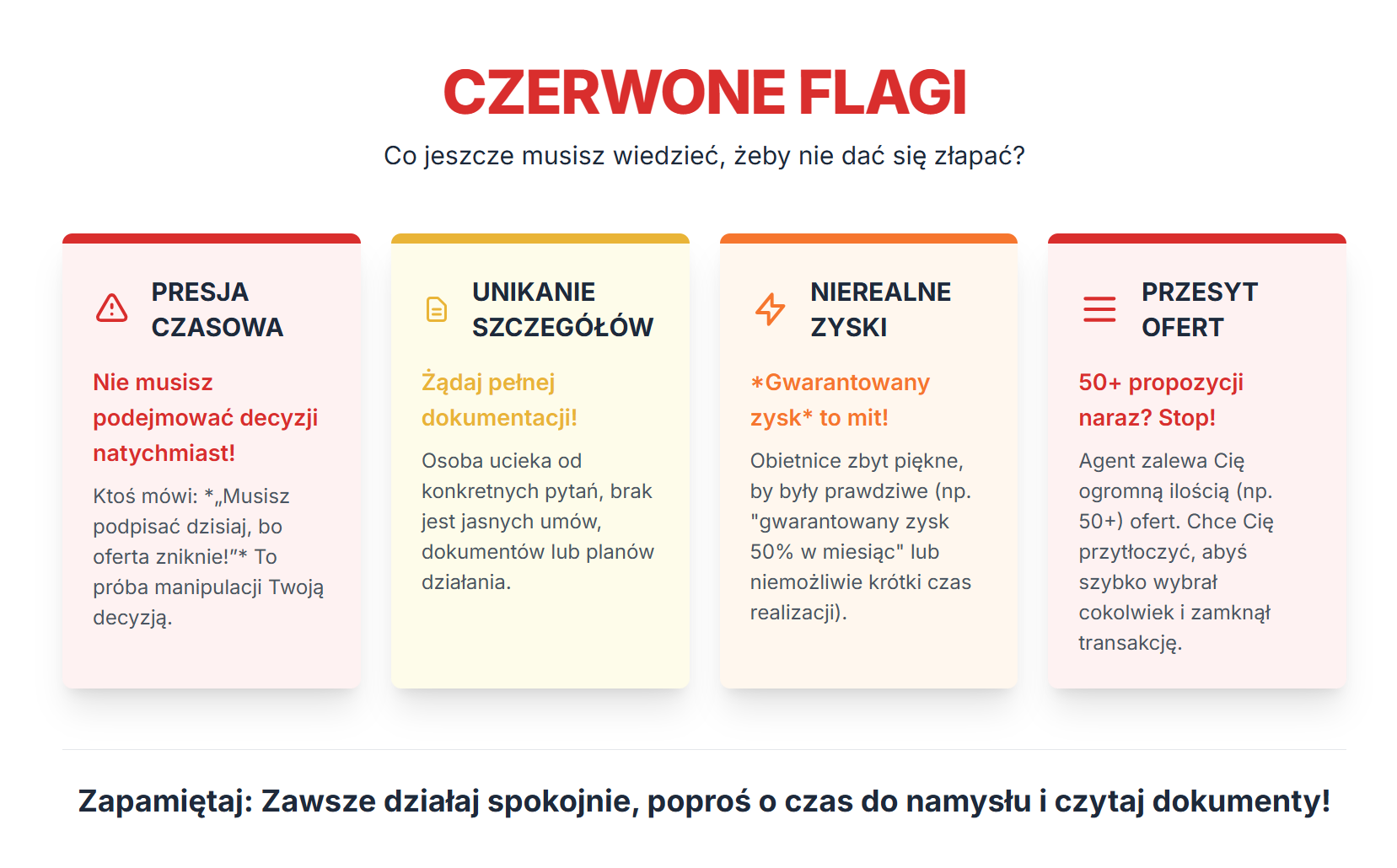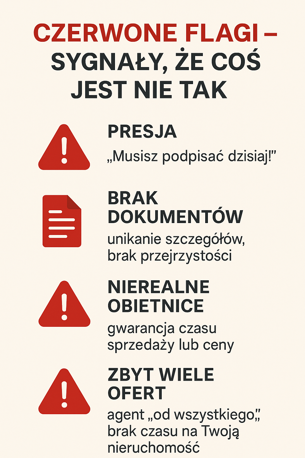 🚩 Presja czasowa 🚩 Brak dokumentów 🚩 Nierealne obietnice 🚩 Zbyt wielu klientów jednocześnie 🚩 Brak konkretów – same ogólniki