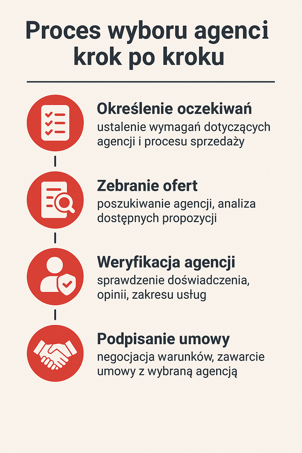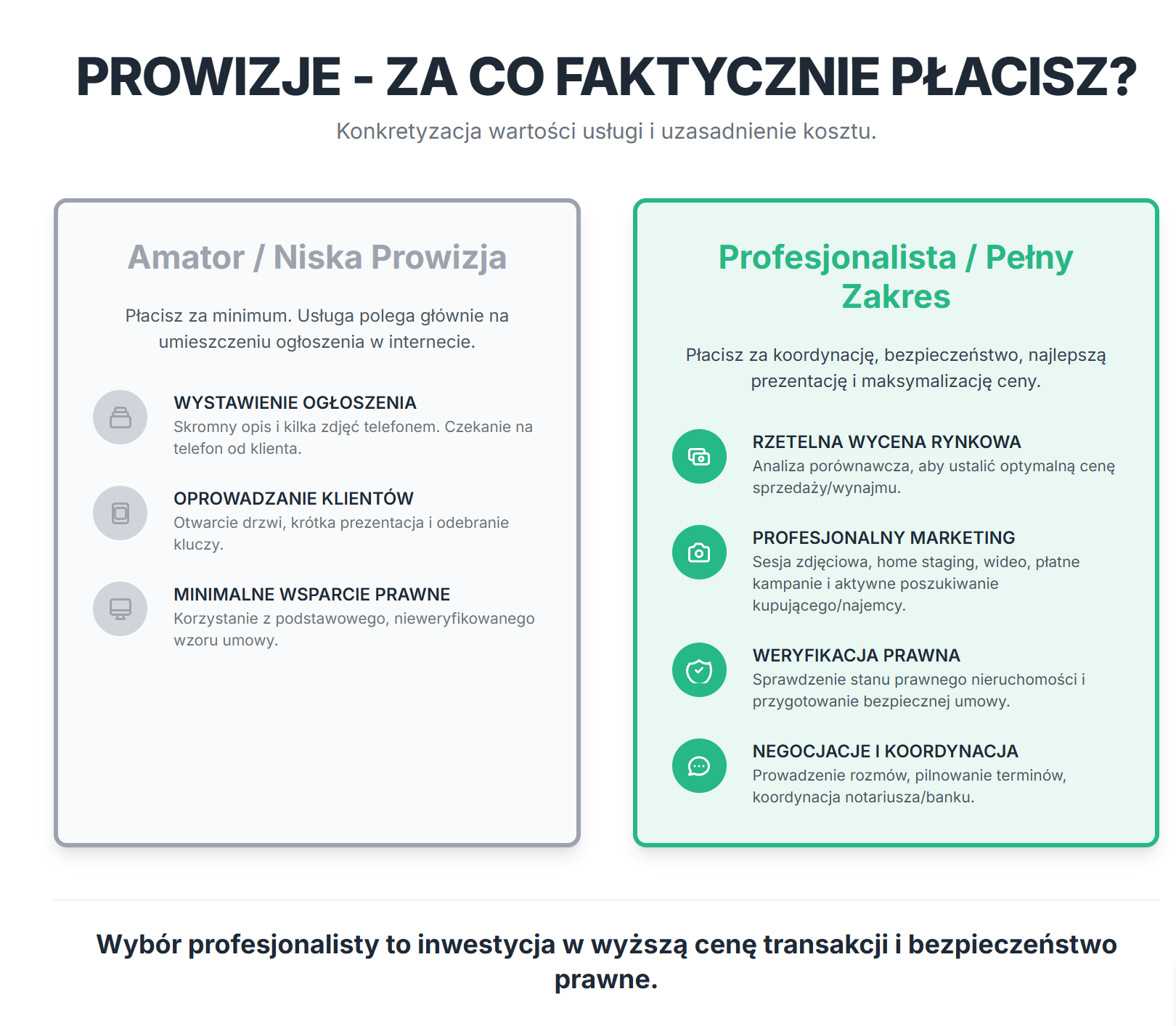 Gdy agent naprawdę oferuje pełen zakres usług i ma udokumentowane sukcesy. Bo tanio wychodzi drogo – lepiej zapłać 4% profesjonaliście, który sprzeda szybko i za dobrą cenę, niż 2% amatorowi, który przedłuży sprzedaż o pół roku i w efekcie stracisz więcej na obniżce ceny.