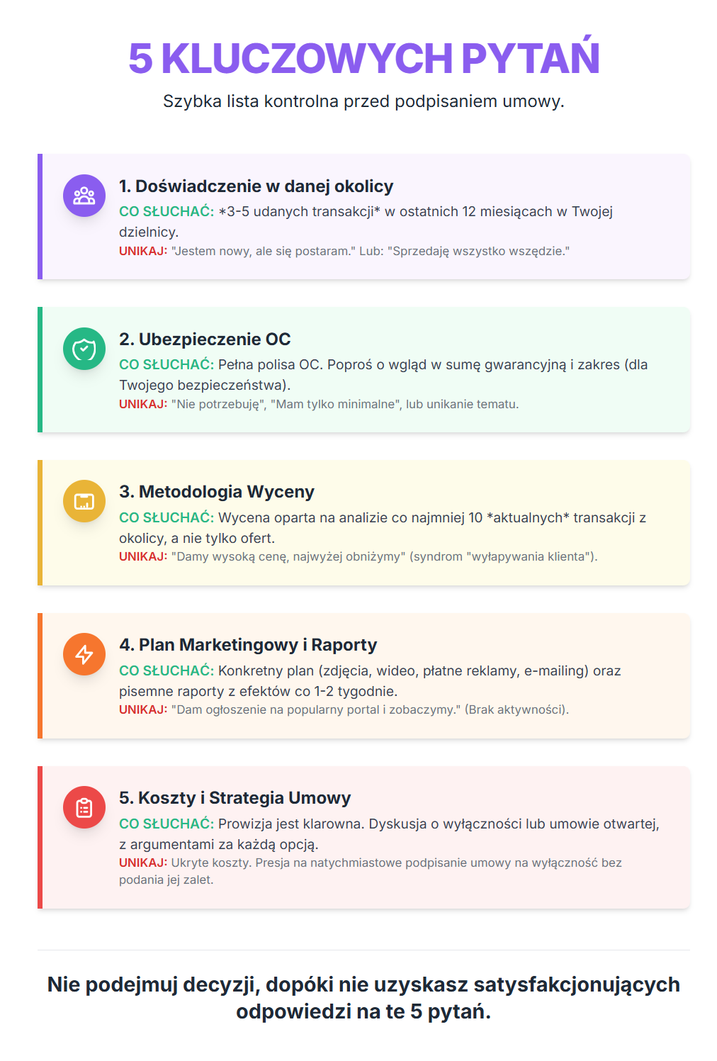 Czy agent zadaje TOBIE pytania? (Dobry agent chce zrozumieć twoje potrzeby, sytuację, deadline)