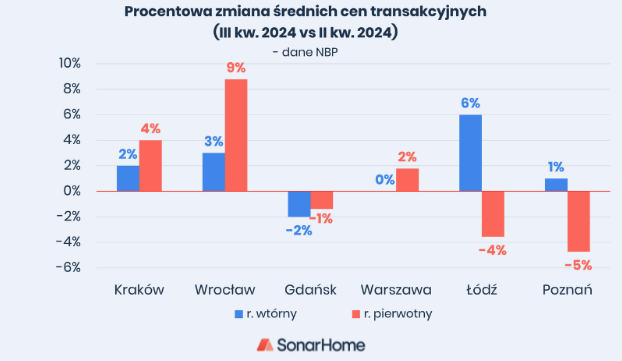 - Średnie ceny ofertowe mieszkań z rynku wtórnego w październiku kolejny miesiąc z rzędu były relatywnie stabilne względem września. W Poznaniu, Krakowie i Warszawie dynamika zmian nie przekroczyła 1%. We Wrocławiu i Łodzi kosmetyczne spadki wyniosły odpowiednio: 1% i 1,5%.Jedynie w Gdańsku odnotowano podwyżkę cen wywoławczych, która wyniosła 2,2%.W drugiej połowie listopada NBP opublikował ceny transakcyjne mieszkań w III kw. 2024 roku. Dynamika zmian cen transakcyjnych mieszkań w największych miastach w Polsce (w porównaniu do poprzedniego kwartału) nie była tak łagodna jak w przypadku cen ofertowych.Na rynku wtórnym przeciętne ceny 1m2 mieszkania wzrosły w Krakowie (2%), Wrocławiu (3%), Łodzi (6%) i lekko w Poznaniu (1%).W Warszawie ceny mieszkań z drugiej ręki nie zmieniły się względem poprzedniego kwartału, a w Gdańsku zarejestrowano spadek o 2%.Wyraźniejsze spadki cen na rynku pierwotnym dotyczyły Łodzi (-4%) i Poznania (-5%) - w tych miastach podaż mieszkań deweloperskich znacząco wzrosła w ostatnim czasie. Lekki spadek o 2% zarejestrowano również w Gdańsku.W stolicy ceny nowych mieszkań wzrosły o 2%, natomiast w Krakowie o 4%. Dynamiczny wzrost o prawie 9% odnotowano we Wrocławiu, nie znamy przyczyn tych zmian, jednak wysoka dynamika wskazuje prawdopodobnie na wyraźną zmianę w strukturze zawieranych transakcji (np. większy obrót mieszkań z wyższego segmentu, lub zmiany w raportowaniu w tym mieście). Należy pamiętać, że ceny transakcyjne, szczególnie te na rynku pierwotnym oddają rzeczywistość nieco cofniętą w czasie, są to wartości z ostatecznych umów sprzedaży, jednak do ich negocjacji w przypadku rynku pierwotnego zachodzi znacznie wcześniej. W przypadku raportowania NBP warto nadmienić, że badania dla III kwartału są przeprowadzane w miesiącach – czerwiec, lipiec, sierpień, a więc zahaczają o II kw. danego roku i nie obrazują całego kwartału, na jaki przypada raportowanie (tutaj III kw. ponieważ pomijany jest wrzesień). NBP dokonuje rewizji danych w minionych kwartałach w miarę z uzupełnianiem bazy danych o wcześniejsze.