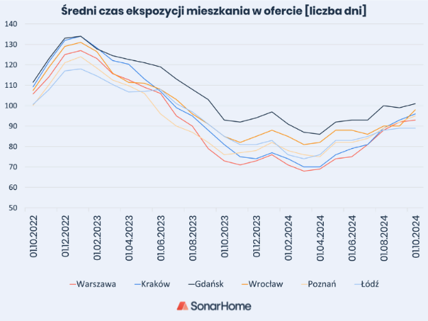- Październik był kolejnym miesiącem, w którym doszło do wydłużania się średniego czasu sprzedaży mieszkań w największych miastach w Polsce. Przeciętny czas ekspozycji mieszkania w ofercie na sześciu największych rynkach wyniósł 95 dni. Zgodnie z danymi SonarHome najmocniejszą zmianę odnotowano we Wrocławiu, gdzie przeciętnie w porównaniu do września czas sprzedaży wydłużył się o 8 dni (9%).W pozostałych miastach zmiany były znacząco mniejsze. W Gdańsku czas jaki był potrzebny do sprzedania mieszkania wyniósł już 101 dni. Blisko tego wyniku pozostawał Wrocław, gdzie mieszkania były w ofercie przez 98 dni. Relatywnie "najszybciej" sprzedawały się lokale w Łodzi (89 dni) i Warszawie (93 dni). Na rynku pojawiają się symptomy, dające nadzieję, na lekkie wyhamowanie trendu wzrostowego w przypadku czasu sprzedaży mieszkań. Do gry wracają kupujący, którzy jeszcze do niedawna mieli nadzieję na Kredyt na Start, jednak informacja o podaniu się do dymisji wiceministra rozwoju i technologii, Jacka Tomczaka, wyraźnie osłabiła przekonania, że ten program ma szanse na wejście w życie. Wiceminister był osobą aktywnie zabiegającą o wprowadzenie programu dopłat do kredytów mieszkaniowych.