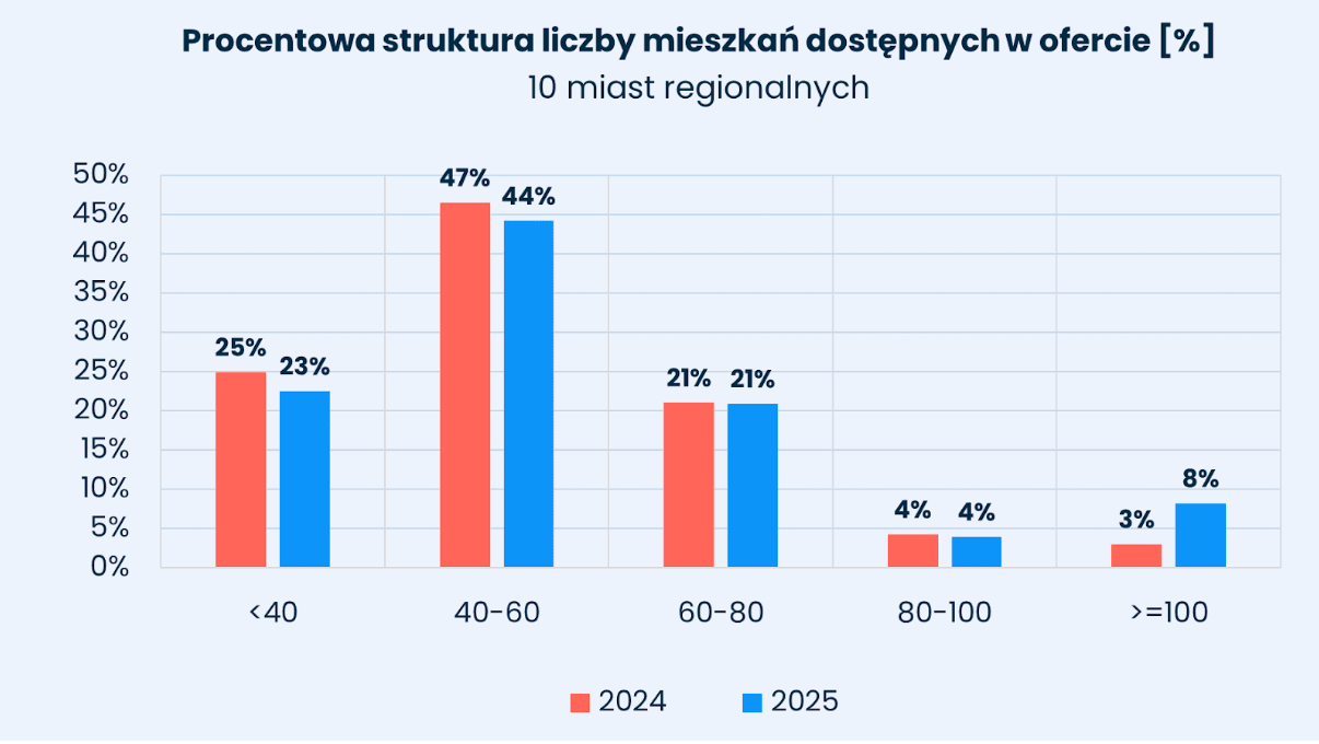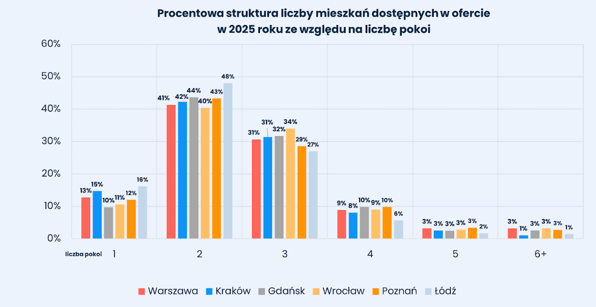 Kawalerki osiągały najwyższy udział rynkowy w Łodzi (16%) oraz w Krakowie (15%). Z kolei mieszkania trzypokojowe szczególnie silnie reprezentowane były we Wrocławiu, gdzie stanowiły 34% oferty. Segment czteropokojowy utrzymywał się na poziomie około 10% w Gdańsku i Poznaniu oraz 9% w Warszawie i Wrocławiu. Struktura ta wskazuje na względną stabilność podaży pod względem funkcjonalnym, przy jednoczesnych różnicach regionalnych.